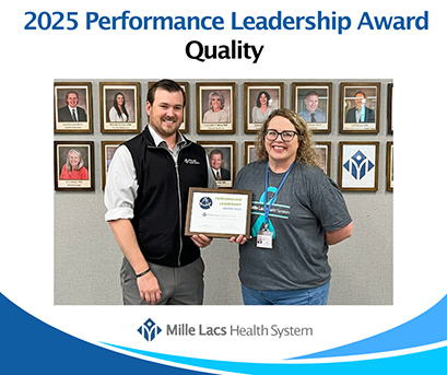 Mille Lacs Health System (MLHS) has earned national recognition for excellence in Quality, receiving a 2025 Performance Leadership Award from The Chartis Center for Rural Health. The award highlights hospitals that consistently achieve strong performance - ranking in the 75th percentile or above - in clinical quality and patient safety.